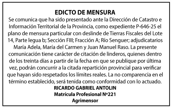 Ha dejado de existir en Esquel a la edad de 93 años. Sus restos serán inhumados este jueves 20 de noviembre de 2025 a...