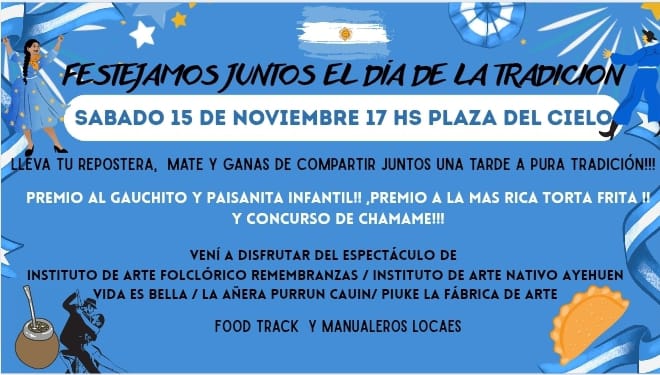 Este sábado 15 de noviembre, desde las 17 horas, la Plaza del Cielo será escenario de una gran fiesta en conmemoración del Día de la Tradición, una jornada que invita a compartir y celebrar las raíces culturales argentinas.