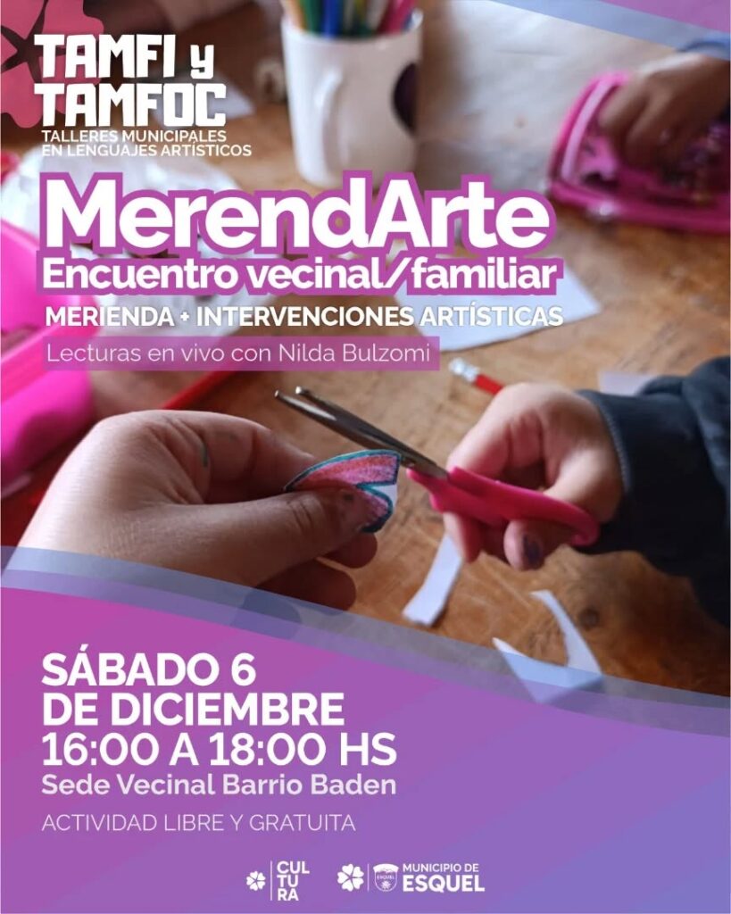 Impulsado desde los talleres TAMFI y TAMFOC, Merendarte se presenta como un espacio comunitario donde el arte se convierte en puente para el encuentro, el acompañamiento y el enriquecimiento colectivo. Durante la jornada, habrá actividades de artes visuales, propuestas lúdicas y momentos musicales pensados para todas las edades.