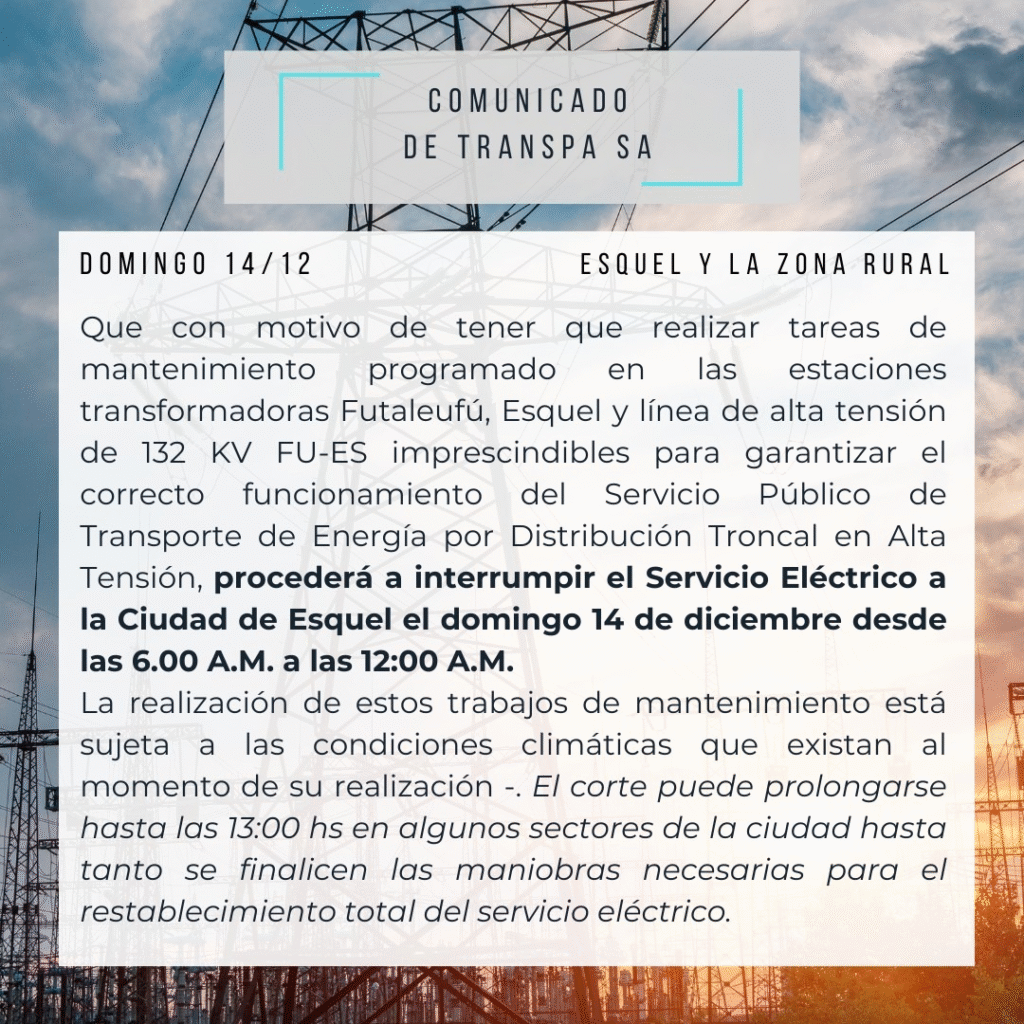 La Cooperativa 16 de Octubre informó que el próximo domingo 14 de diciembre habrá un corte general de energía eléctrica que afectará a Esquel y a la zona rural de la localidad. De acuerdo con lo informado, se realizarán tareas de mantenimiento programado en las estaciones transformadoras Futaleufú y Esquel, y en la línea de alta tensión de 132 kV FU-ES.