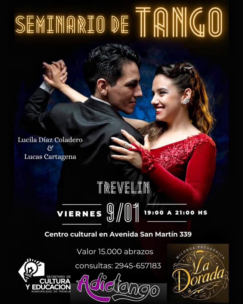La Secretaría de Cultura y Educación de la Municipalidad de Trevelin invitó a participar del Seminario de Tango, que se realizará mañana viernes, de 19 a 21 horas, en el Centro Cultural (Avenida San Martín 339).