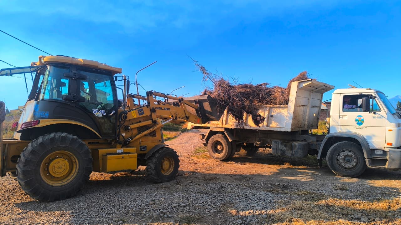 La Dirección de Servicios Públicos y Recolección de Residuos trabaja con maquinaria en la intersección de las calles 30 de Abril y Los Rifleros de Trevelin, llevando adelante tareas de retiro y limpieza de restos vegetales secos y ramas.