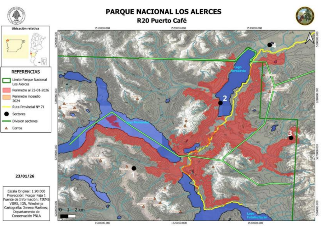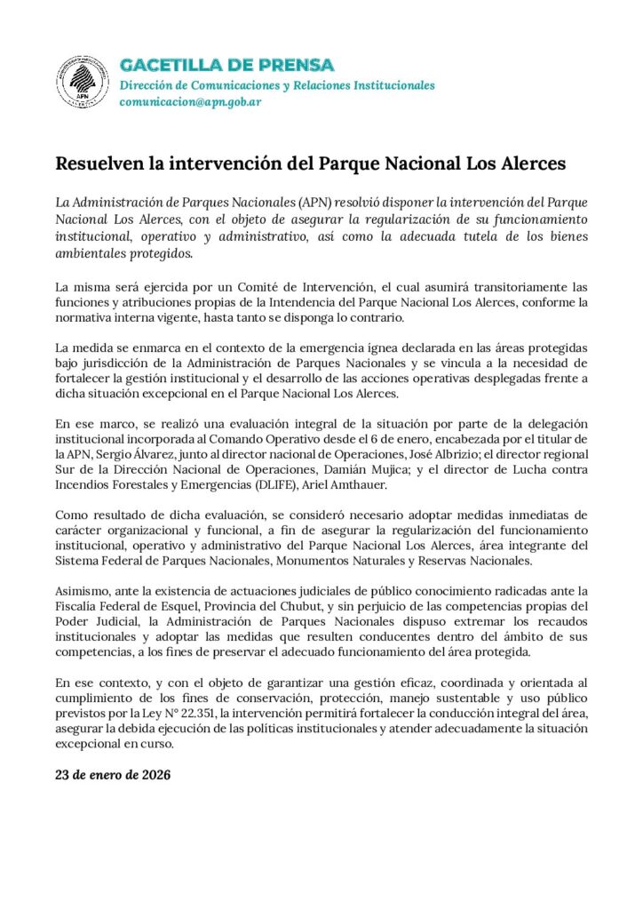 Cabe recordar que durante la noche del viernes y en medio de la emergencia ígnea, la Administración de Parques Nacionales resolvió intervenir el Parque Nacional Los Alerces con el objetivo de regularizar su funcionamiento institucional, operativo y administrativo, fortalecer la gestión y garantizar la adecuada tutela de los bienes ambientales protegidos. La medida será ejercida de manera transitoria por un Comité de Intervención.