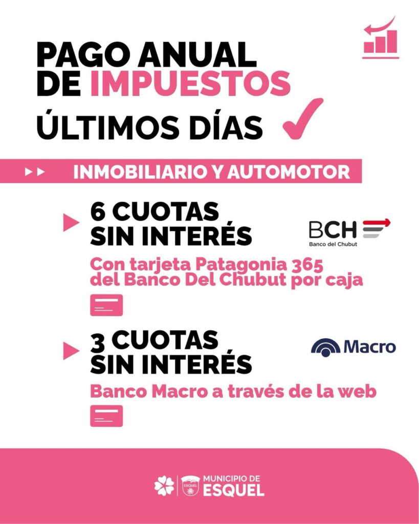 La Municipalidad de Esquel informó que este viernes 30 y sábado 31 de enero son los últimos días para acceder al pago anual de impuestos, con beneficios especiales y opciones de financiación para los vecinos.