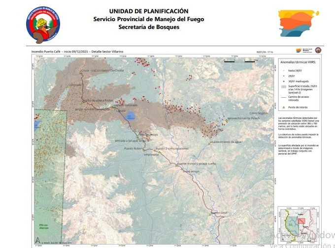 El municipio de Esquel informó que, de acuerdo con la información brindada por el Servicio Provincial de Manejo del Fuego, durante el día viernes los focos ígneos permanecieron activos en la zona de Laguna Villarino, con avance en dirección este. En el sector se realizaron tareas de enfriamiento y apertura de fajas, con el acompañamiento de medios aéreos y la utilización de maquinaria vial.