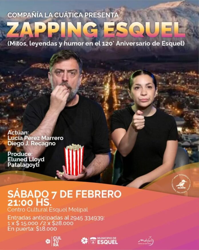 “Zapping Esquel” propone un recorrido ágil y desopilante por aquellas anécdotas, mitos y leyendas que forman parte del imaginario colectivo esquelense. Además, el espectáculo convoca al público a participar: esas historias escuchadas o vividas en la ciudad se transforman en material humorístico sobre el escenario, reforzando el vínculo con la identidad local.