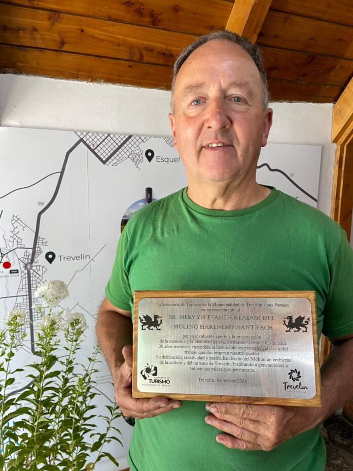 La Secretaría de Turismo de la Municipalidad de Trevelin entregó una placa de reconocimiento a Mervyn Evans, creador del emblemático Molino Harinero Nant Fach, al cumplirse 30 años de su valioso aporte a la preservación de la memoria y la identidad galesa.