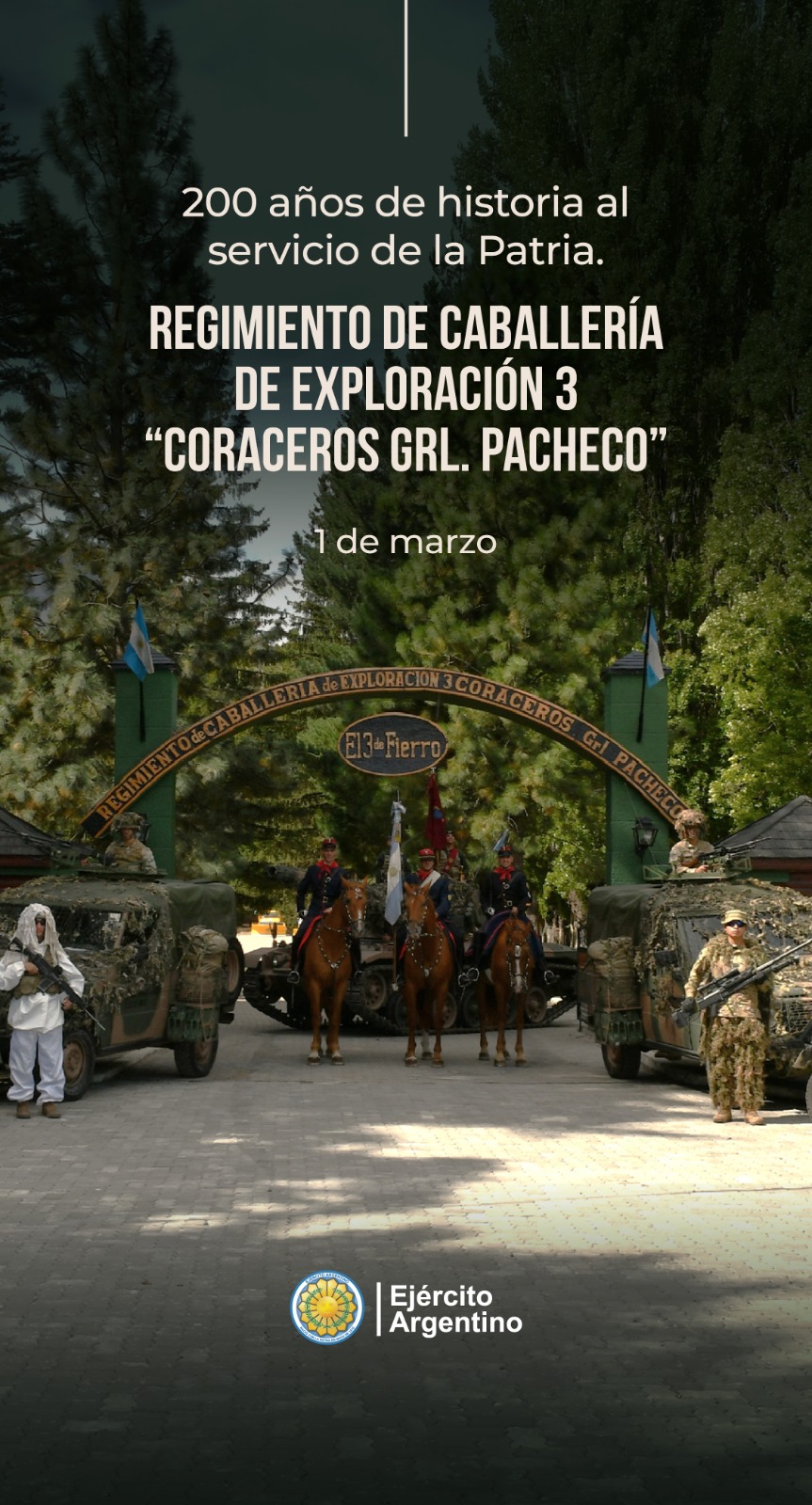 El Ejército Argentino conmemoró ayer 1º de marzo el 200° aniversario de la creación del Regimiento de Caballería de Exploración 3 “Coraceros General Pacheco”, unidad histórica del Arma de Caballería cuyo origen se remonta al 1º de marzo de 1826.