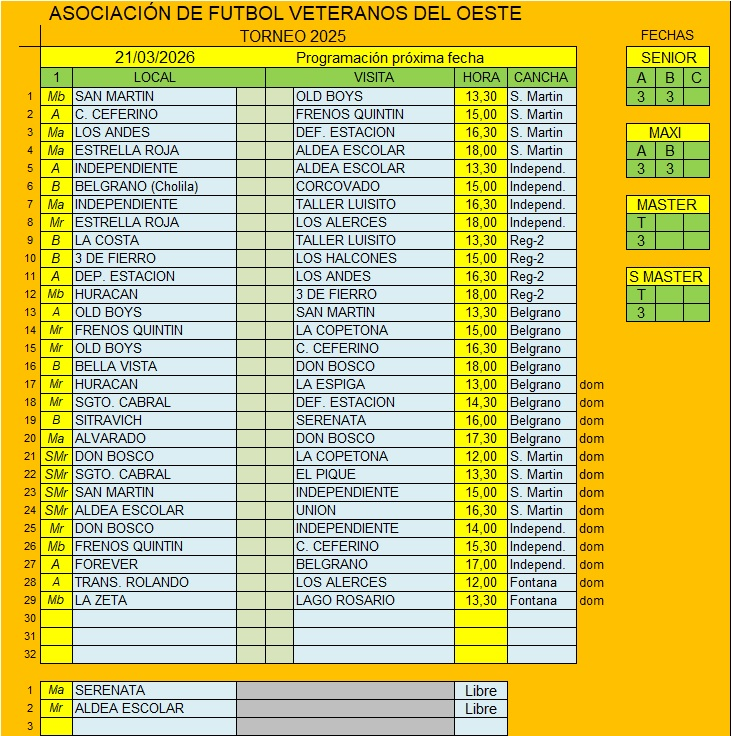 Entre el sábado y el domingo, el torneo de la Asociación de Fútbol de Veteranos del Oeste desarrollará la tercera fecha del campeonato 2026.
