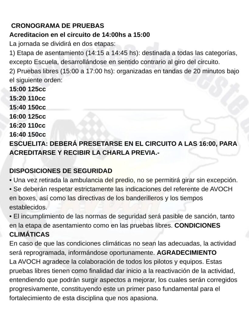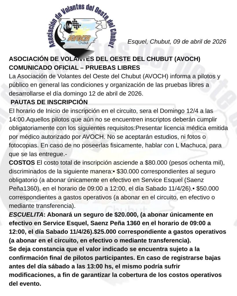 Desde la organización recordaron que será requisito obligatorio contar con la licencia médica 2026 para poder girar en pista. Además, al momento de la inscripción, los participantes deberán presentar sin excepción la licencia médica provisoria. El costo de la actividad estará determinado por el valor del seguro médico, que será confirmado próximamente.